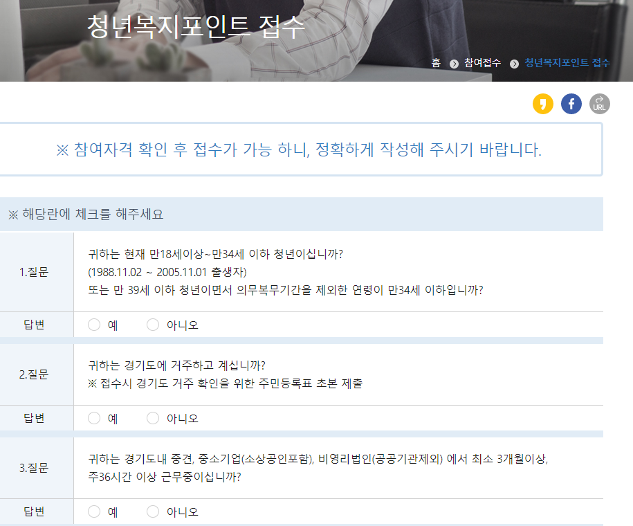 - 경기도에 거주하는 만 18세 이상~ 만 34세 이하의 청년 노동자 (병역 의무 이행자는 병역의무이행 기간만큼 신청 연령 연장(최고 만 39세)