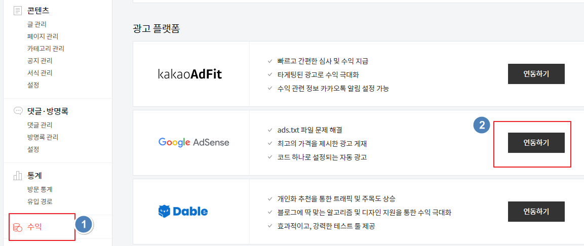 하단 광고 플랫폼 중 'Google Adsense'를 연동하기 위해 '연동하기' 클릭합니다.