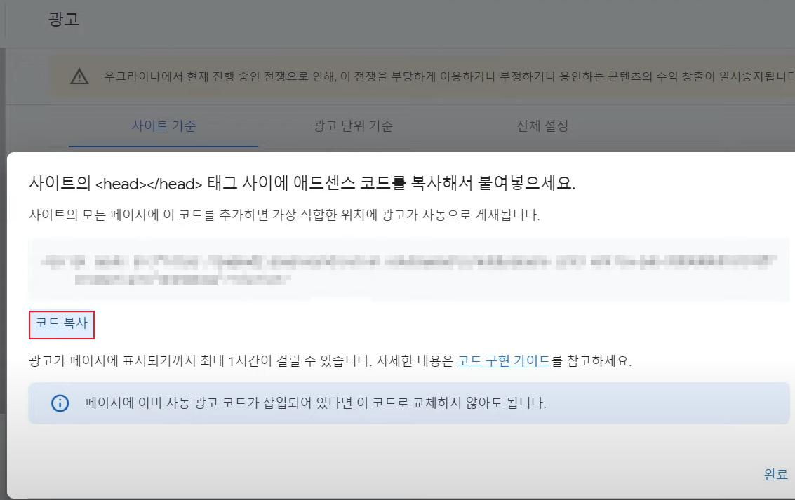 애드센스 계정과 블로그 연동이 완료되었습니다.