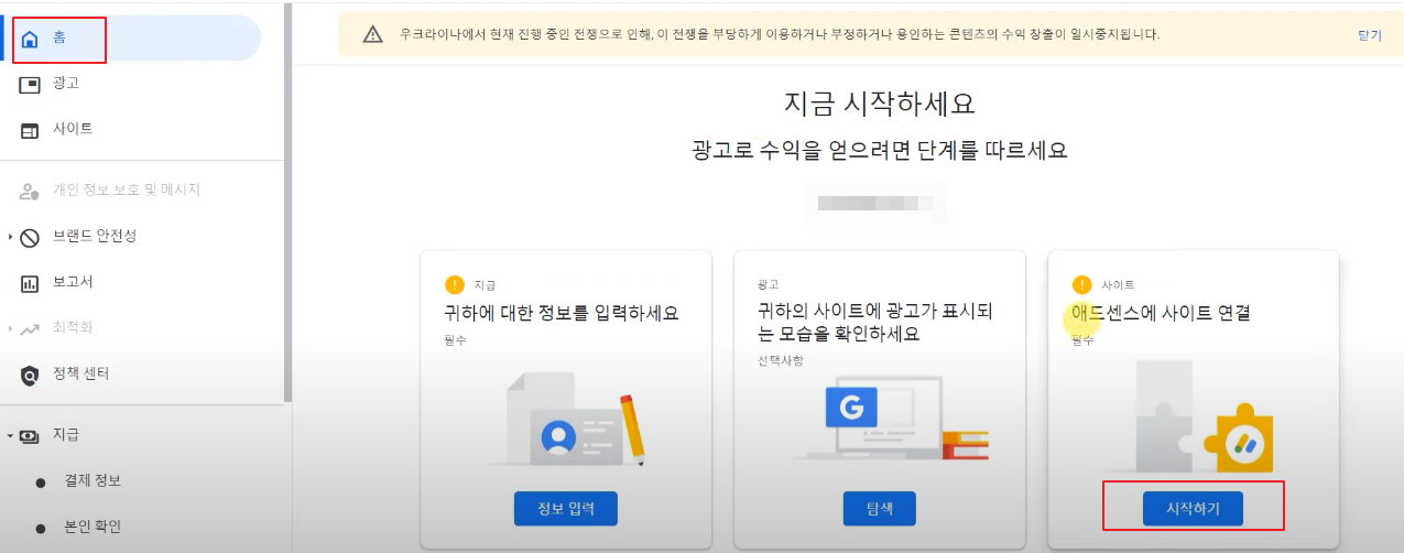 홈 화면에서 '애드센스에 사이트 연결' 시작하기를 눌러줍니다.