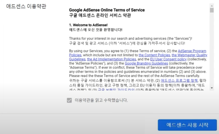 - 애드센스 이용약관 - '이용약관을 읽고 수락했습니다' 체크박스 체크 후 우측 하단의 파란색 '애드센스 사용 시작' 버튼을 누릅니다.