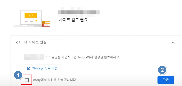 Tistory에서 설정을 완료했습니다 - 체크 후 다음을 눌러줍니다.