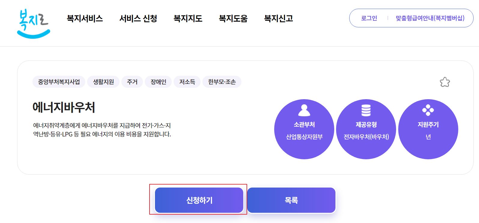 로그인 > 서비스 신청 > 복지서비스 신청 > 복지급여 신청 > 저소득층 > 에너지바우처
