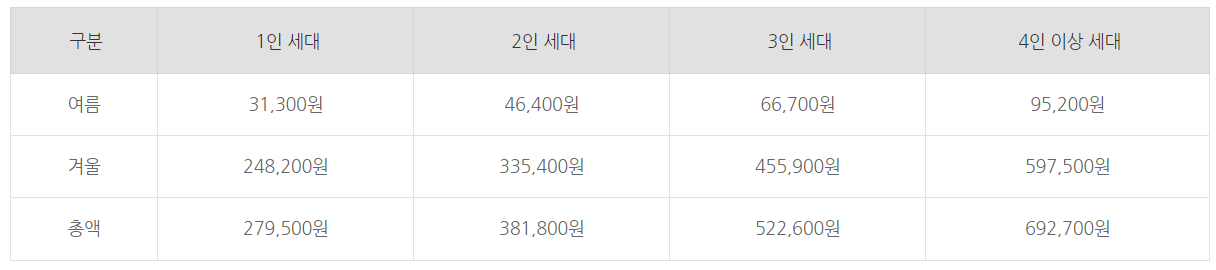 7~9월에는 전기요금을 차감받을 수 있고 10월~이듬해 4월까지는 전기·도시가스·지역난방·등유·연탄·LPG 중 한 가지를 선택하여 구입할 수 있는 전자바우처(이용권)를 세대원수에 따라 4단계로 차등 지급합니다.