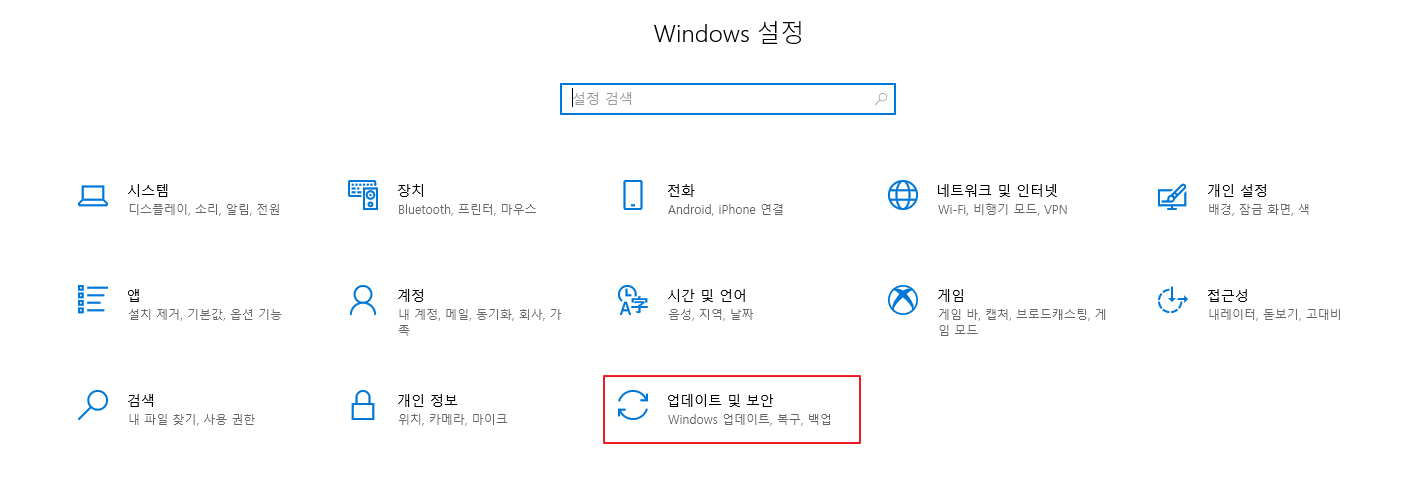 [설정] 메뉴 중에서 [업데이트 및 보안] 항목을 선택합니다.
