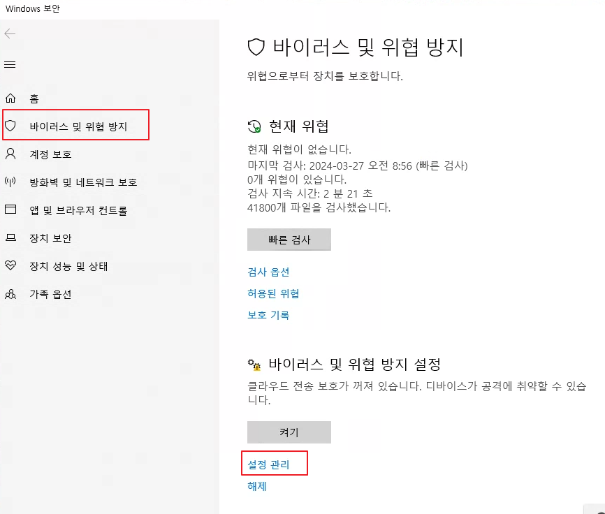 오른쪽 항목 중에서 [바이러스 및 위협 방지 설정]의 아래의 [설정 관리] 메뉴를 클릭합니다.