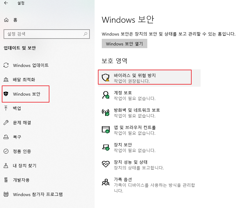 좌측 첫 번째의 [바이러스 및 위협 방지] 탭을 클릭합니다.
