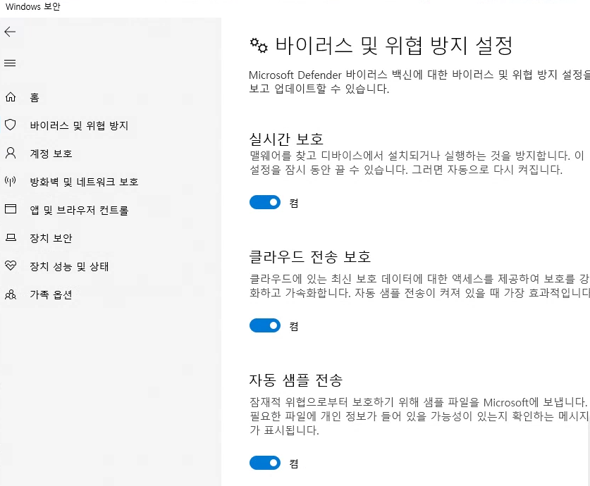 실시간 보호는 물론이고 윈도우 디펜더의 기능을 모두 '끔'으로 설정 비활성화를 하면 됩니다.