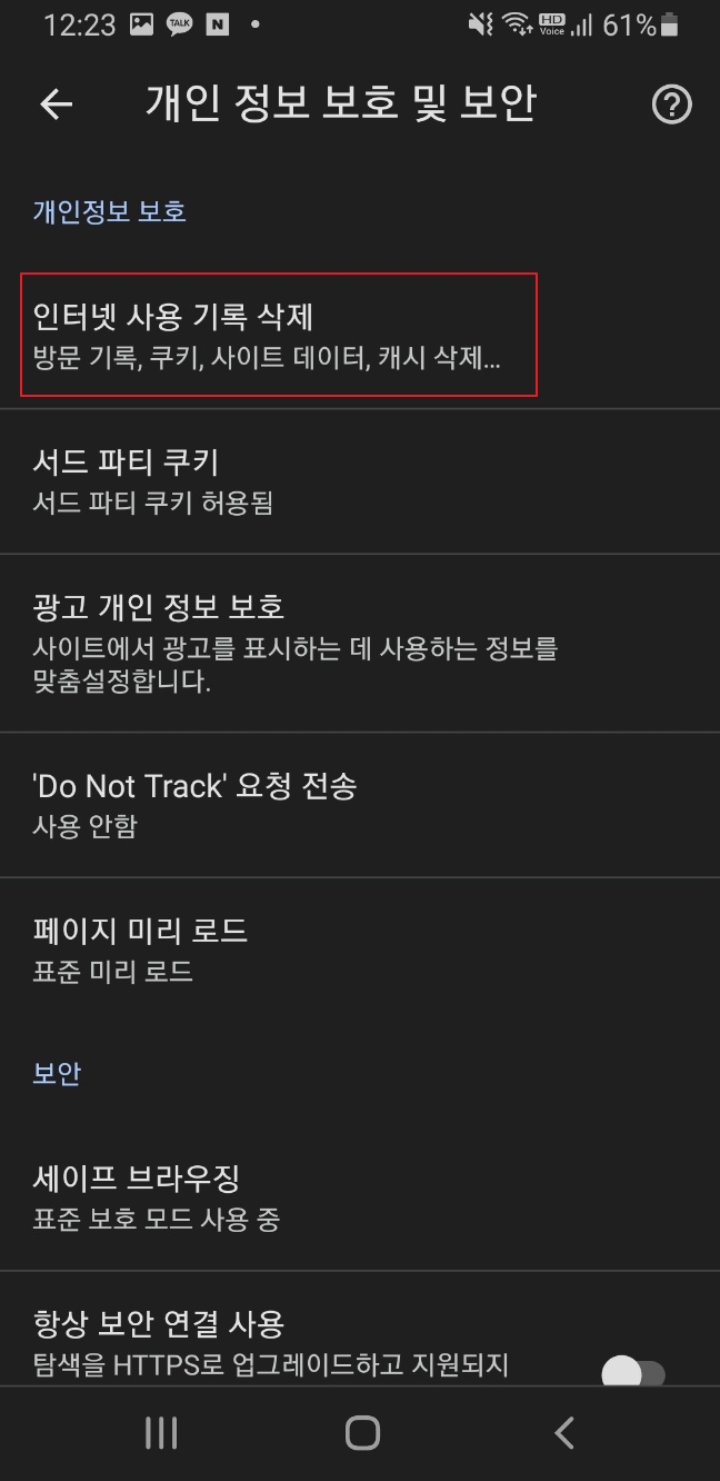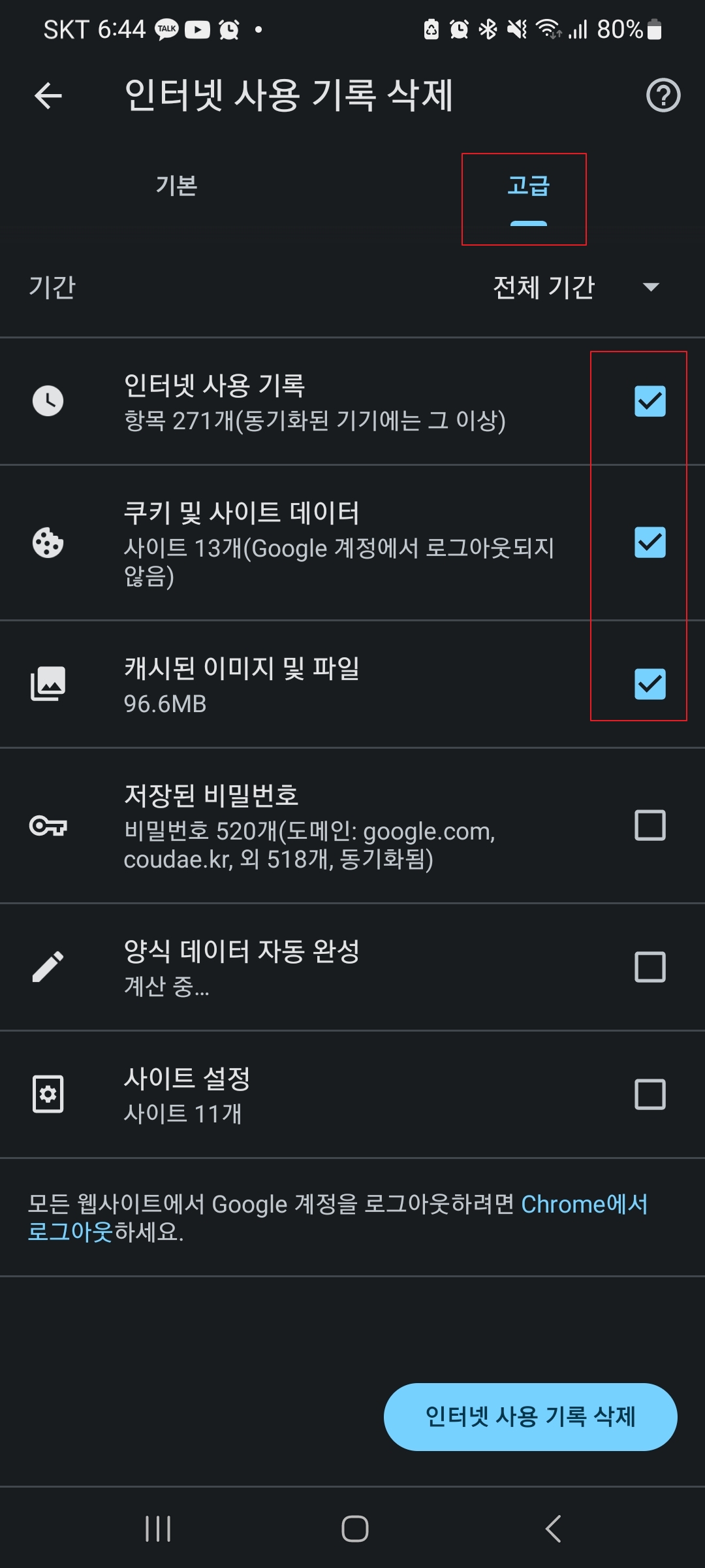 인터넷 사용 기록 삭제 > 쿠키 및 사이트 데이터 > 인터넷 사용기록 삭제