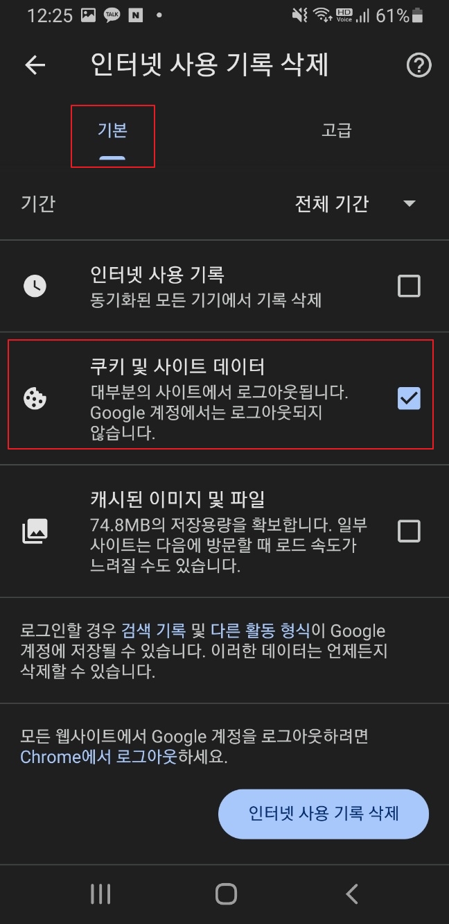 [쿠키 및 사이트 데이터] 항목을 체크 선택하고 맨 아랫쪽에 (인터넷 사용기록 삭제)를 눌러주세요.