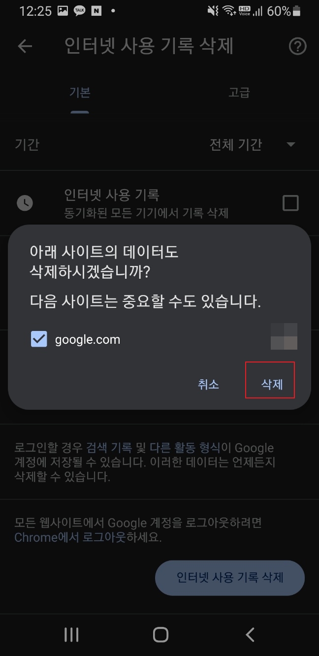 자주 사용하는 사이트가 있다면 해당 사이트도 삭제 할지를 다시한번 물어봅니다.