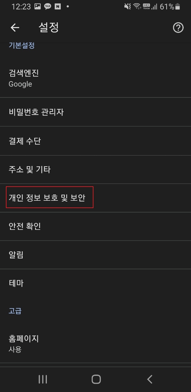 기본설정 중간에 [개인 정보 보호 및 보안] 탭을 눌러주세요.